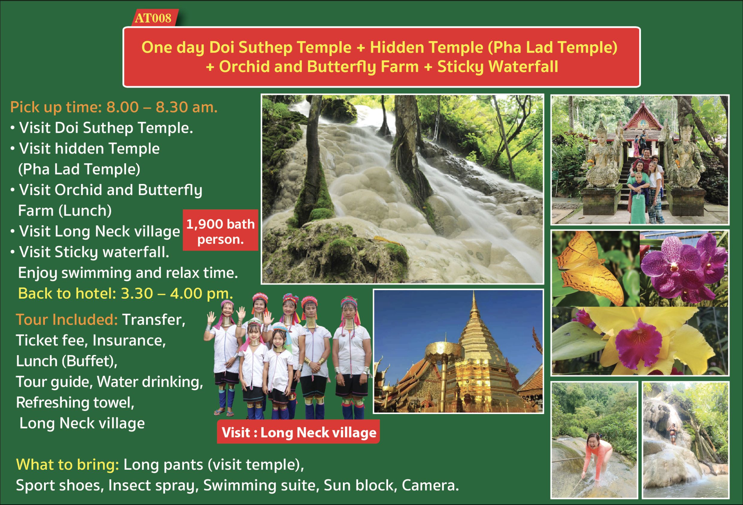All about the AT008 One day Doi Suthep Temple + Hidden Temple (Pha Lad Temple) + Orchid and Butterfly Farm + Sticky Waterfall.